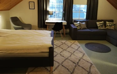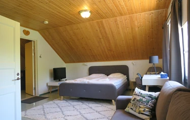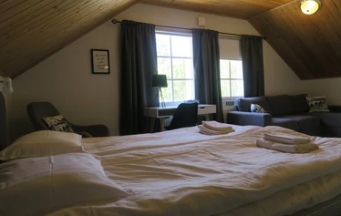 Beautiful and spacious hotel room with a double bed on the upper floor of the mansion (air conditioning, toilet, shower, fridge, microwave). Bed linen is included in the price. As an additional service, 1-2 additional beds are available (120 cm sofa bed).