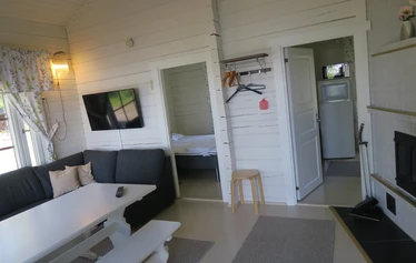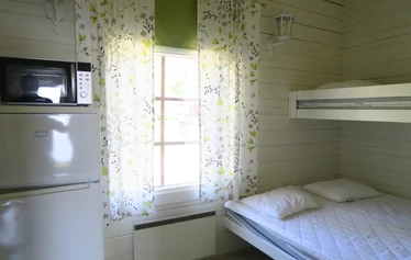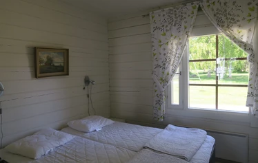 Vuodetilat neljässä huoneessa: kahden hengen makuuhuone, neljän hengen makuuhuone, yhden hengen pieni huone ja tupakeittiössä 1-2 hengen vuodesohva.