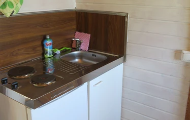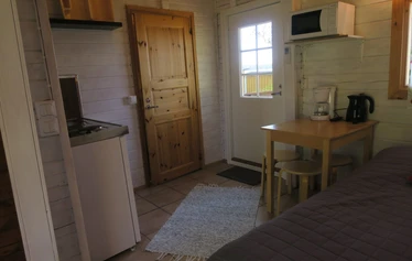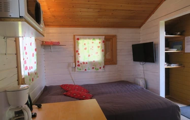 Tunnelmallinen mökki kolmelle (nro 27), josta löytyy ilmastointi/ilmalämpöpumppu, oma WC ja suihku, minikeittiö, astiasto, mikro, TV, 160 cm parisänky ja pieni makuualkovi yhdelle. Terassi on suoraan uimarannalle päin - terassilta pääset kätevästi uimaan ja nautit auringonlaskuista. Koko yht. n. 25 neliötä.