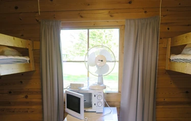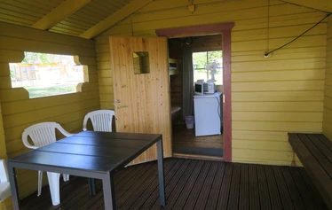 Neljän hengen retkeilymökki kahdella kerrossängyllä. Mökissä myös jääkaappi, mikro ja iso terassi järvelle päin.